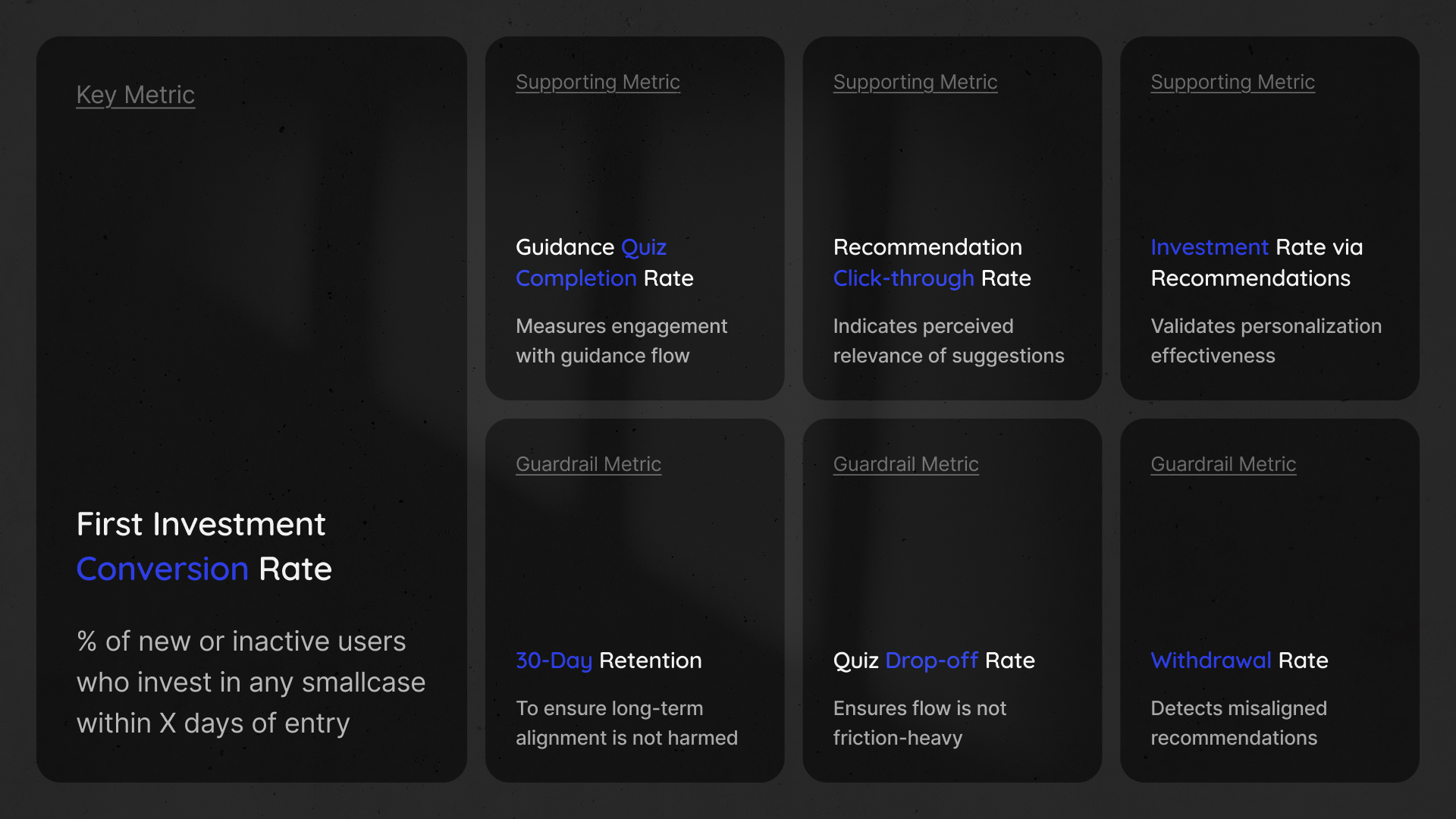 Improve activation rate by ~15% in 6 months for new/passive investors by reducing decision confusion at the investment selection stage.