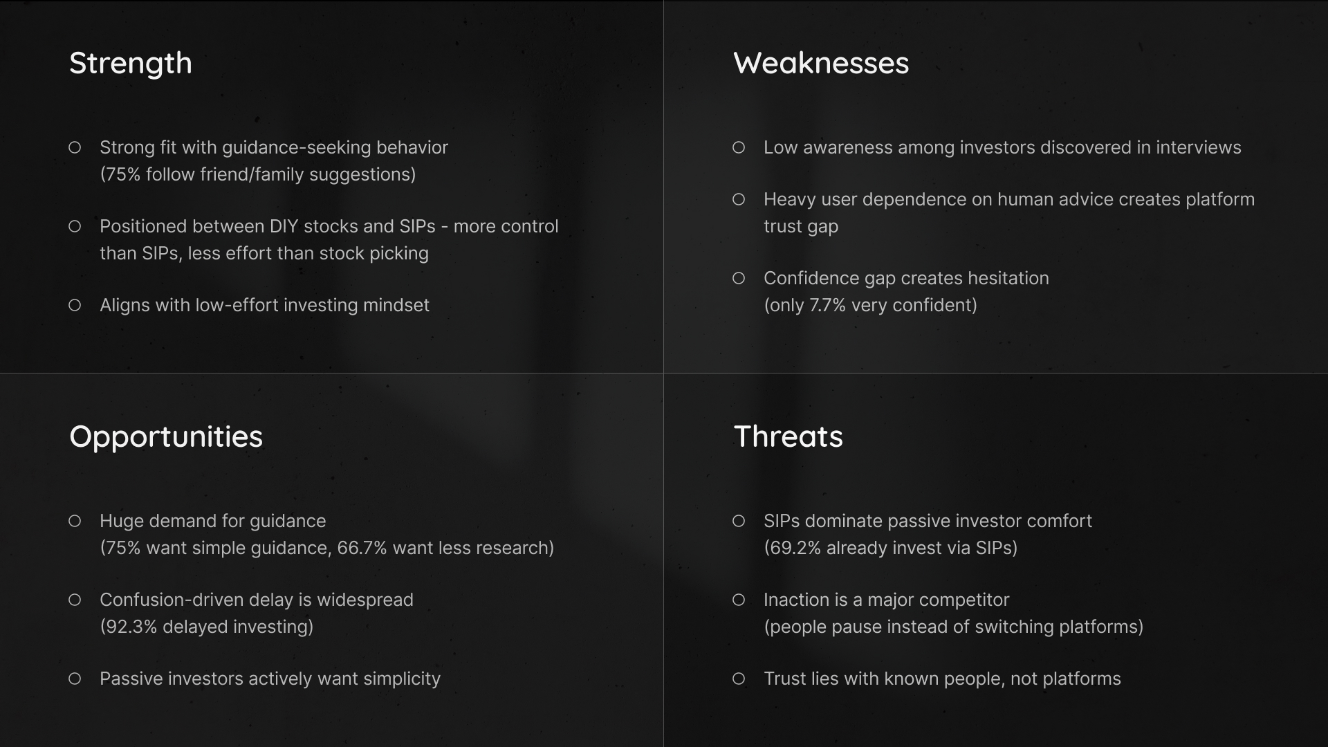 To understand why investors hesitate or avoid using investment platforms, I conducted primary research combining qualitative interviews and quantitative validation.