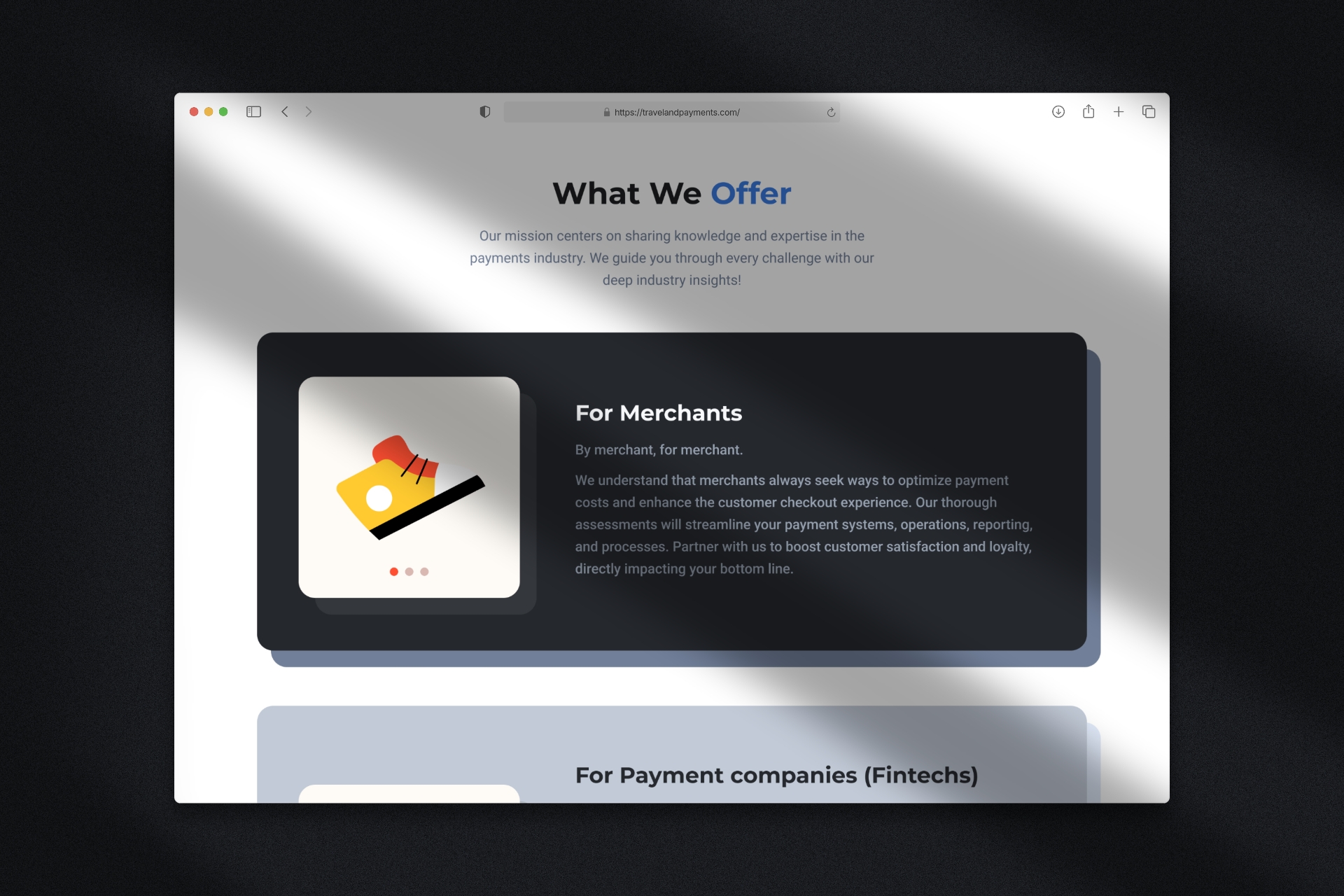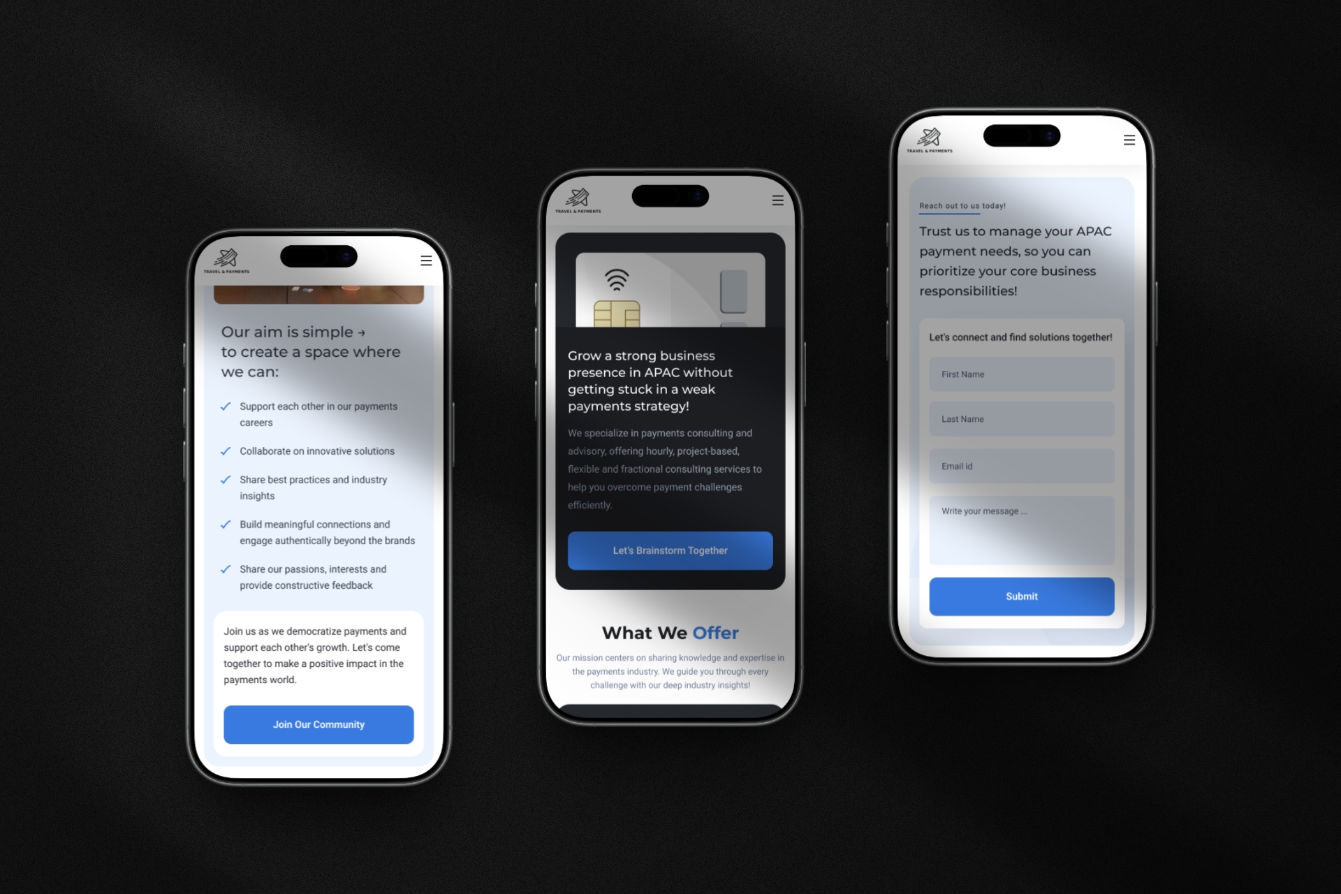Travel & Payments, a consulting firm specializing in payments advisory services, needed an online presence to showcase their expertise and services. The goal was to create a minimal, professional website that clearly communicated their value proposition while providing easy access to their card game product PC'd and community engagement opportunities.